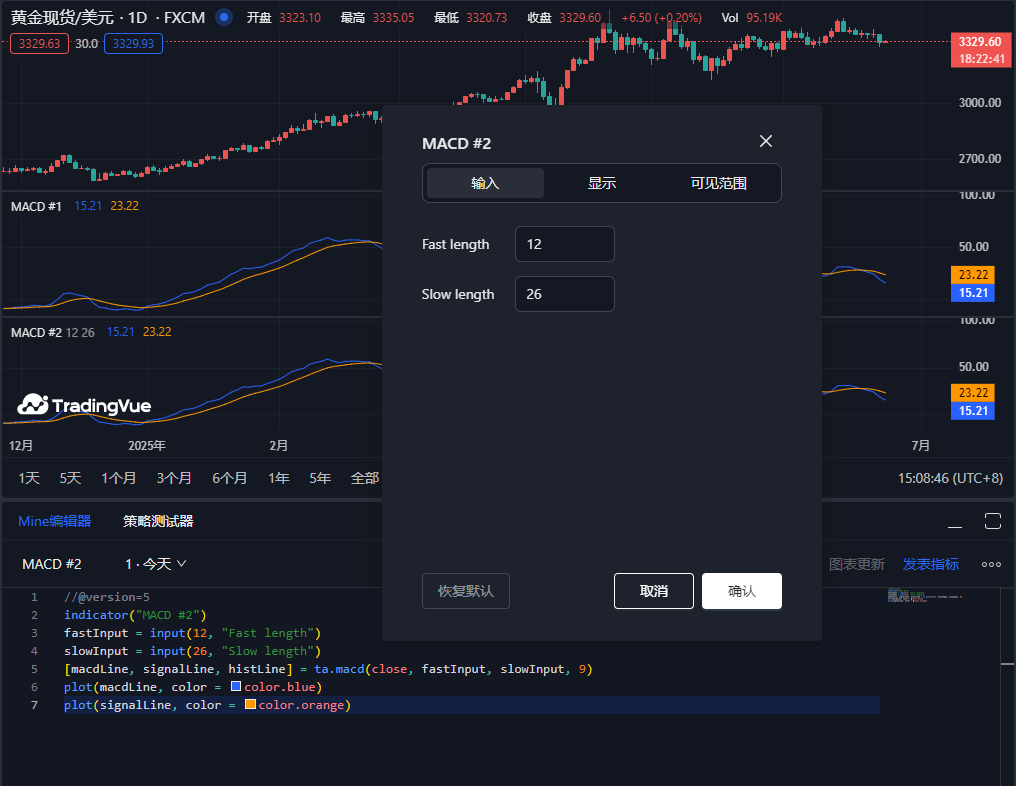 我们的脚本的第一个版本“手动”计算了 MACD,但由于 Mine Script 旨在编写指标和策略,因此许多常见指标都具有内置的 Mine Script 函数,其中包括一个用于 MACD 的函数: ta.macd()。