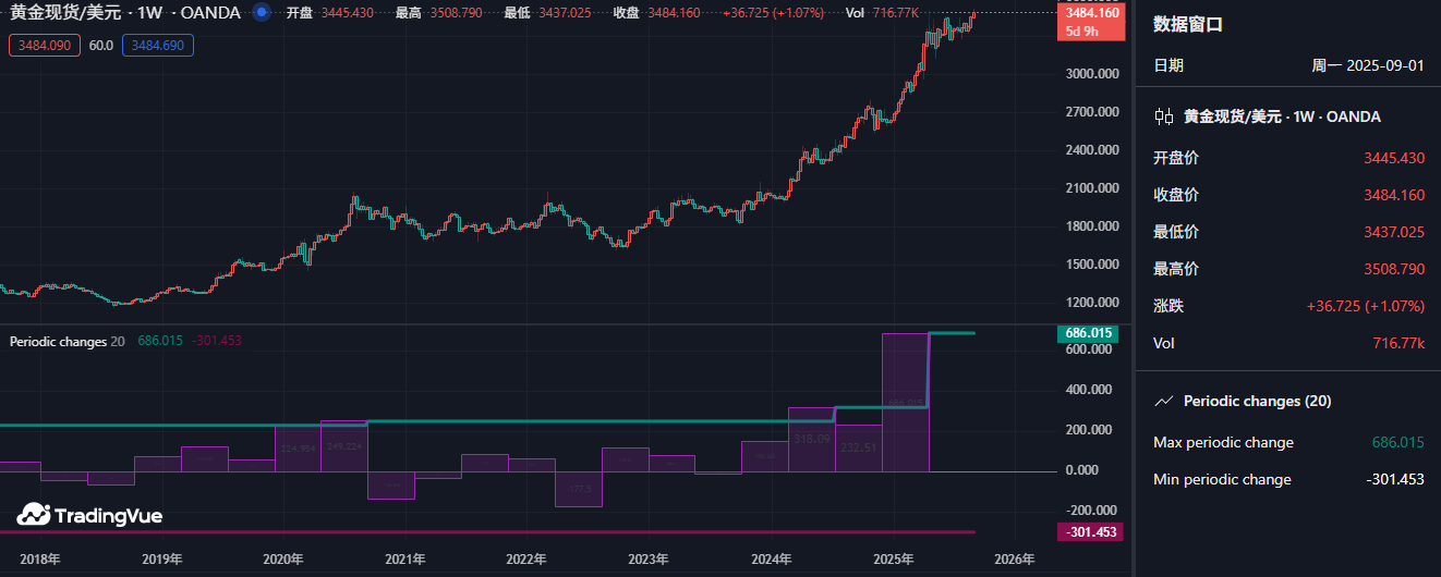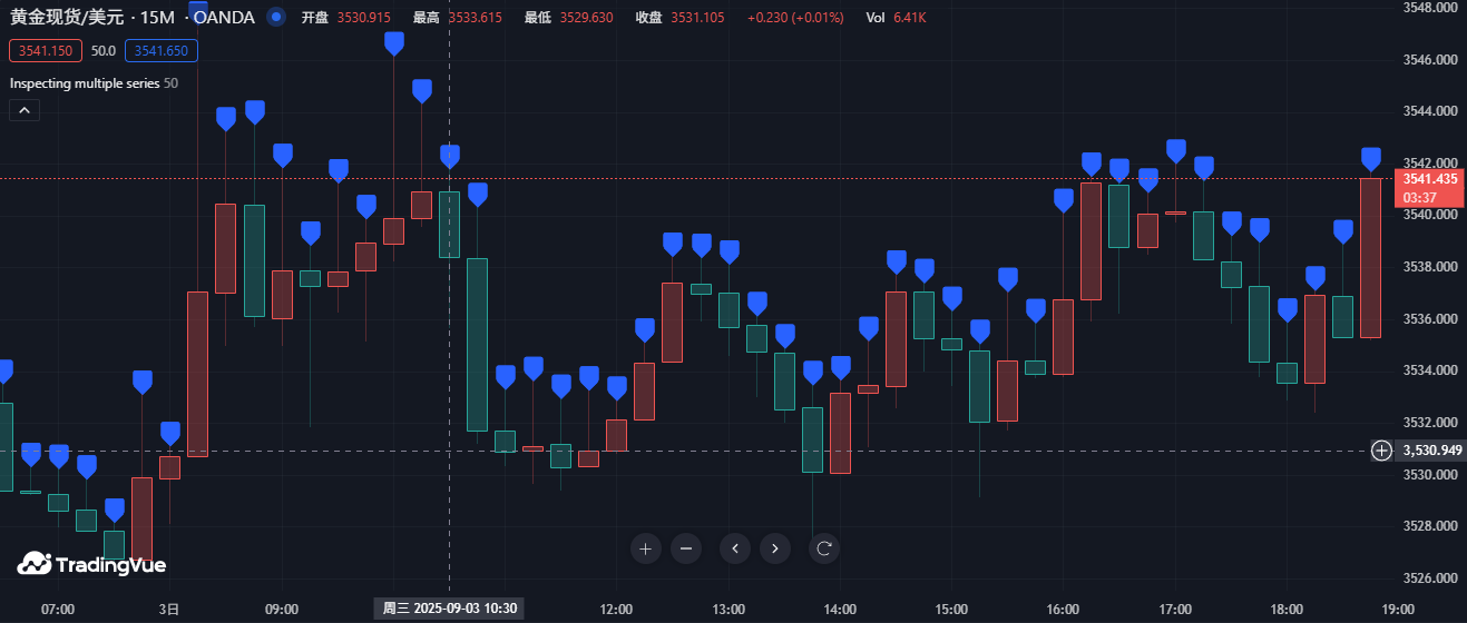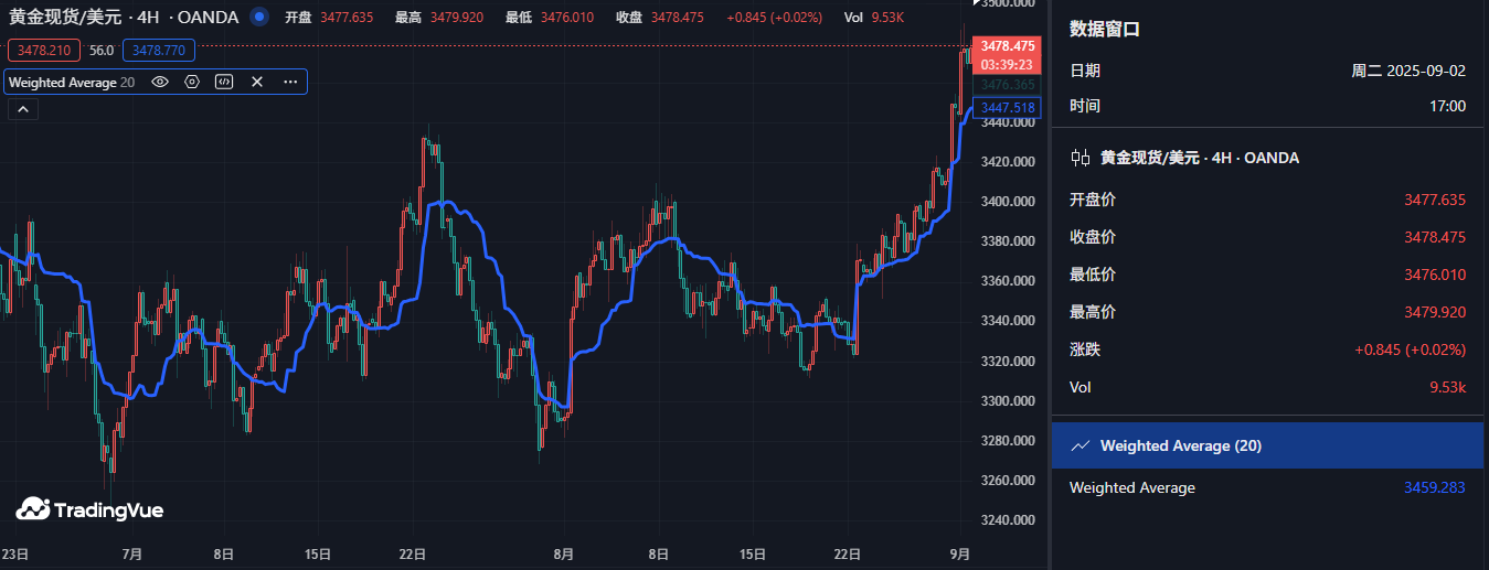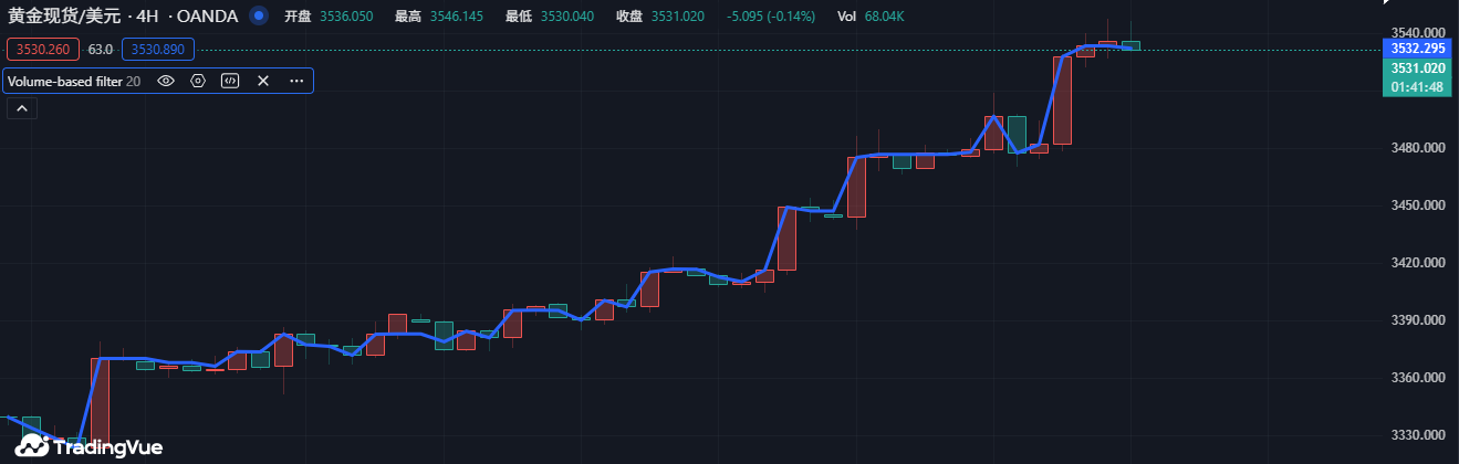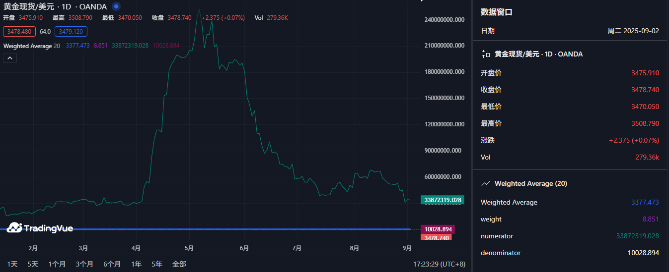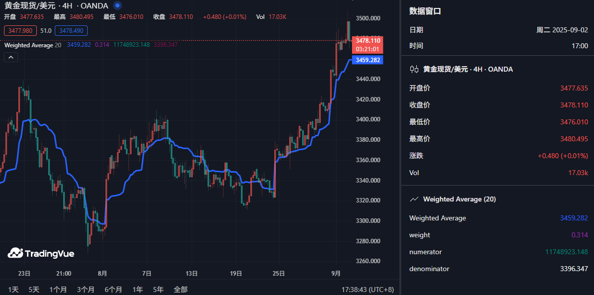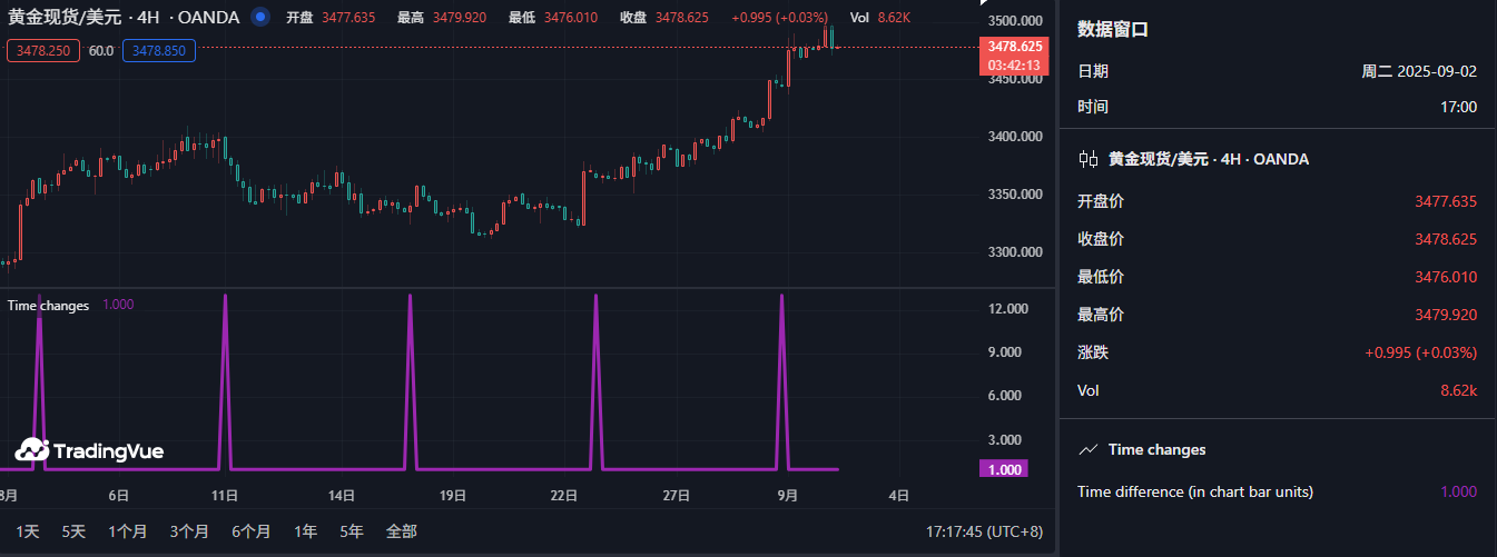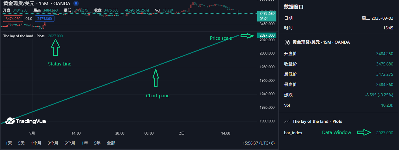 - 脚本状态行和数据窗口中显示的数字反映图表光标所在位置的绘制值。当鼠标指针未悬停在图表上时,这些区域将显示最新柱的值。