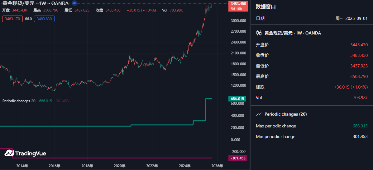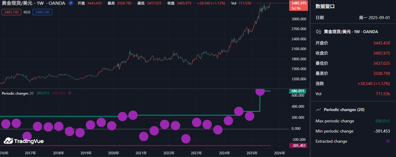 下面我们在全局作用域中添加了初始值为na的debugChange变量,脚本在if结构中使用局部change变量重新为其赋值。现在,我们可以通过plot()函数使用debugChange变量查看可用change值的历史记录:
