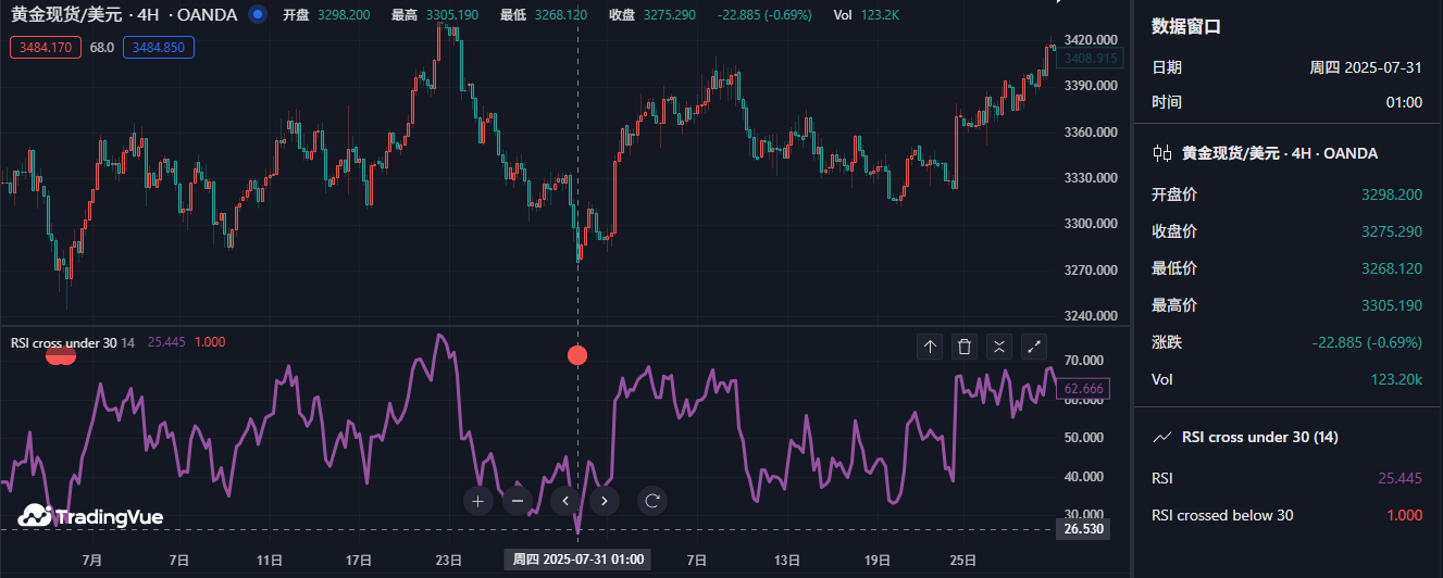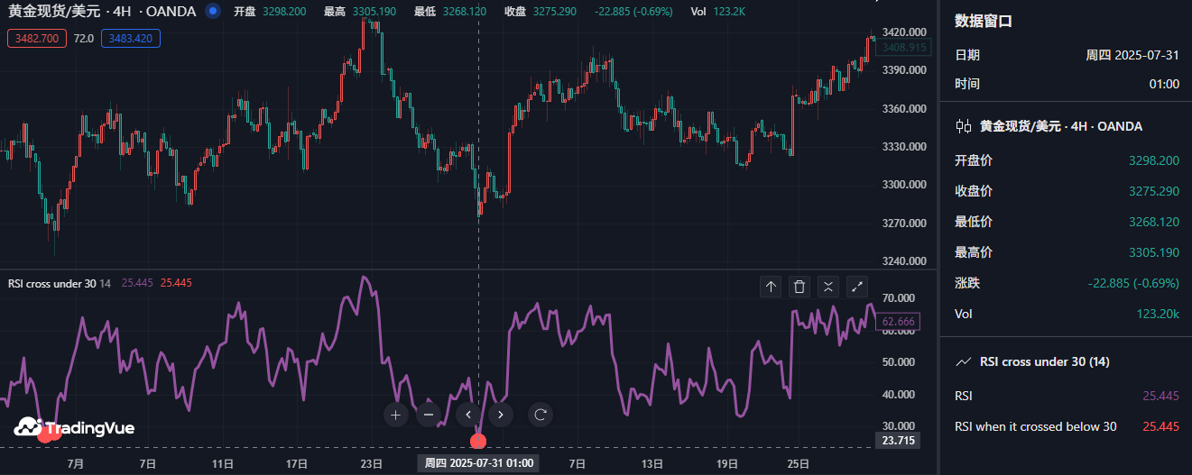 让我们使用这些函数检查一个条件。以下脚本计算长度为lengthInput的RSI指标,并声明crossBelow变量,其值为当RSI下穿30时返回true的条件结果。脚本调用plotshape()在每次条件发生时在窗格顶部附近显示圆形: