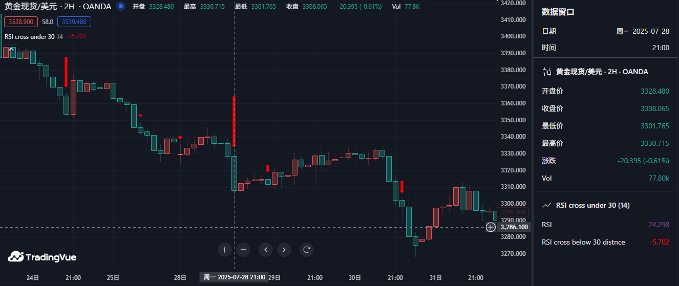 此示例展示了使用plotarrow()检查crossBelow条件的另一种方法。在此版本中,我们在indicator()函数中将overlay设置为true,并添加了plotarrow()调用来可视化条件值。本示例中的debugNumber测量每次条件发生时rsi低于30的幅度: