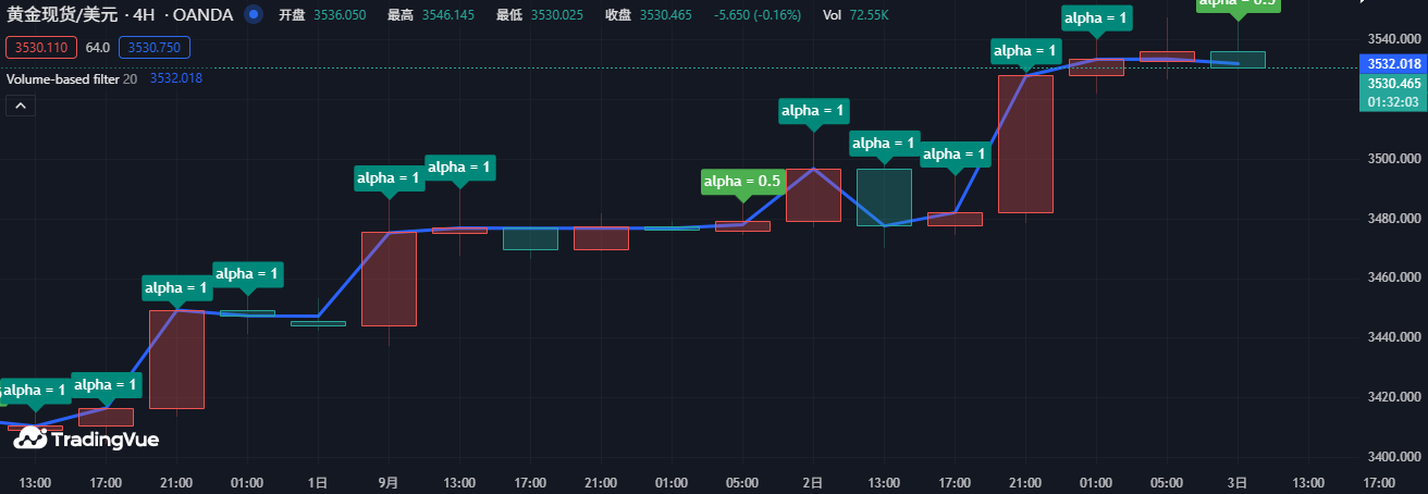 请考虑以下脚本,它计算一个带有平滑参数(alpha)的自定义过滤器,该参数在 if 结构内根据近期成交量条件改变其值: