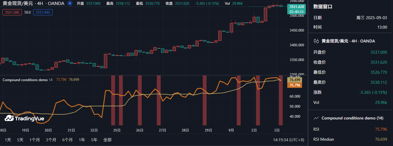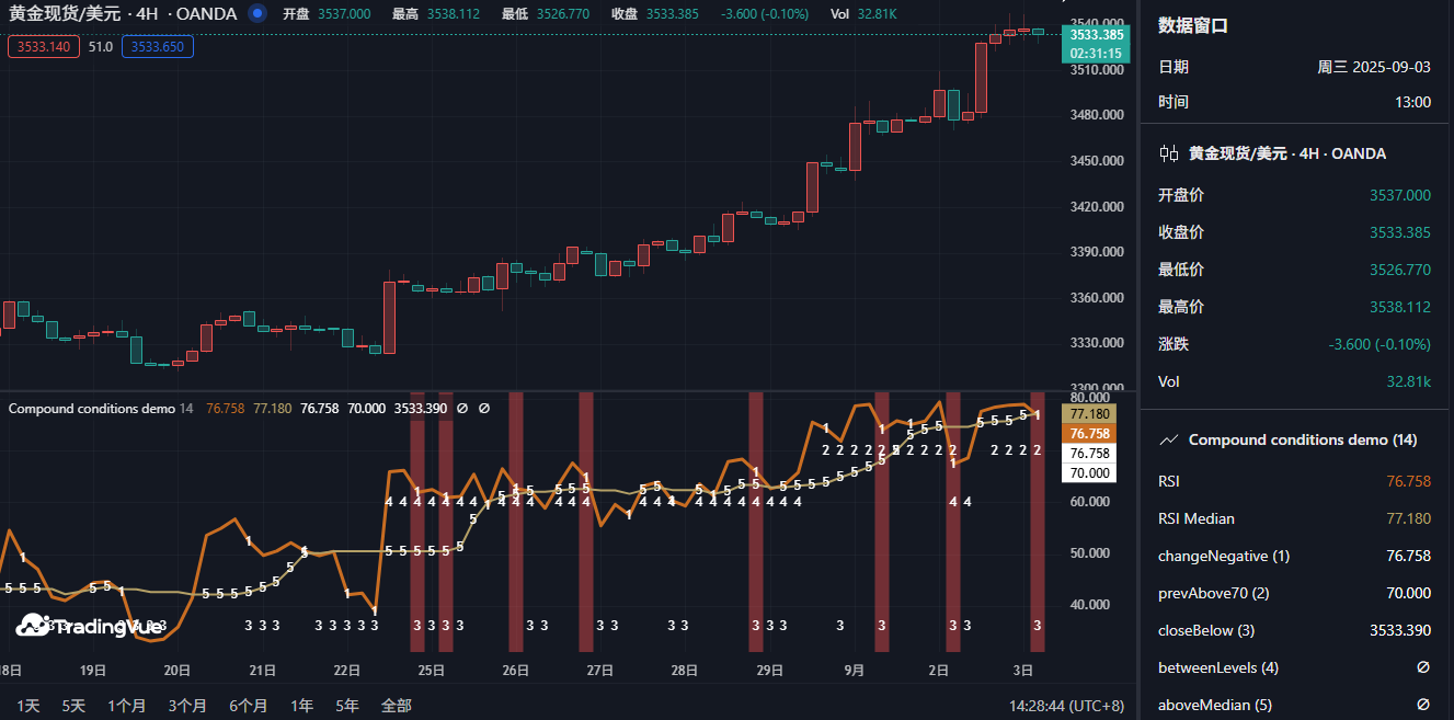 例如,此脚本计算 rsi 及其在 lengthInput 根K线上的中位数。然后,它创建五个变量来表示不同的单一条件。该脚本在逻辑表达式中使用这些变量为 compoundCondition 变量分配“布尔”值,并使用条件背景颜色显示 compoundCondition 的结果: