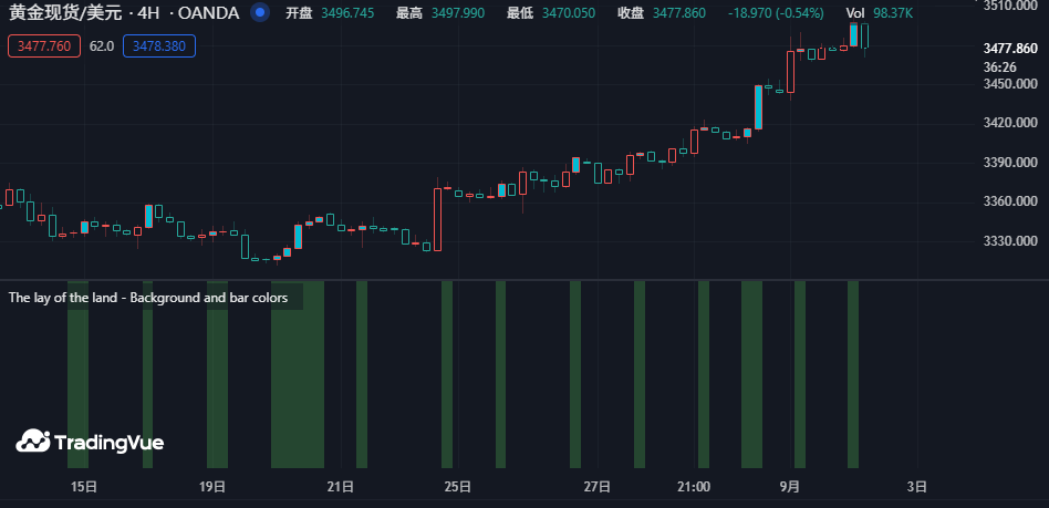 bgcolor()函数可在脚本面板背景中显示颜色,而barcolor()函数可更改主图表K线或蜡烛的颜色。这两个函数为条件可视化提供了简单方法: