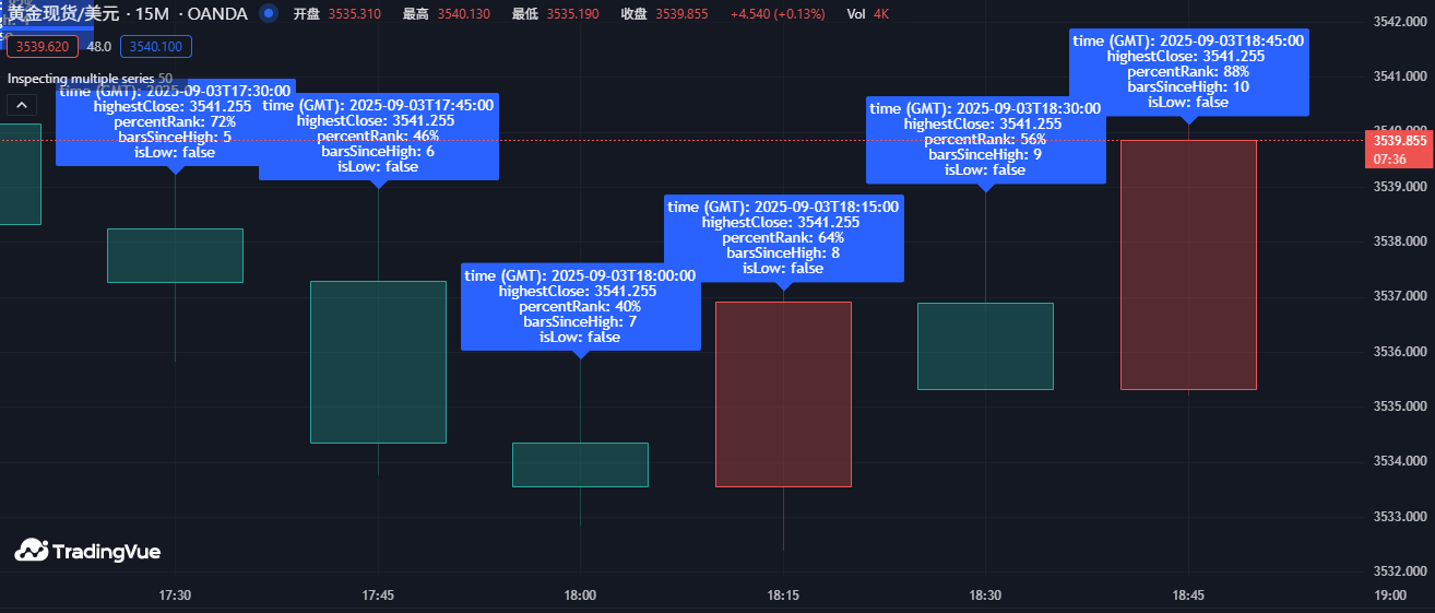 当程序员希望通过绘制数值、设置背景或图表K线颜色等方式检查用户定义函数的局部变量时,必须将这些值提取到全局作用域,因为生成此类输出的内置函数只能接受全局变量和字面量。