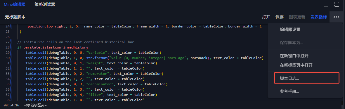 - Mine 日志面板最多显示历史K线上最近的 10,000 条条目。如果脚本在历史K线上生成超过 10,000 条日志,且程序员需要查看更早的条目,可以使用条件逻辑将