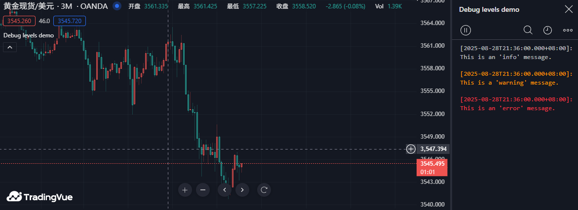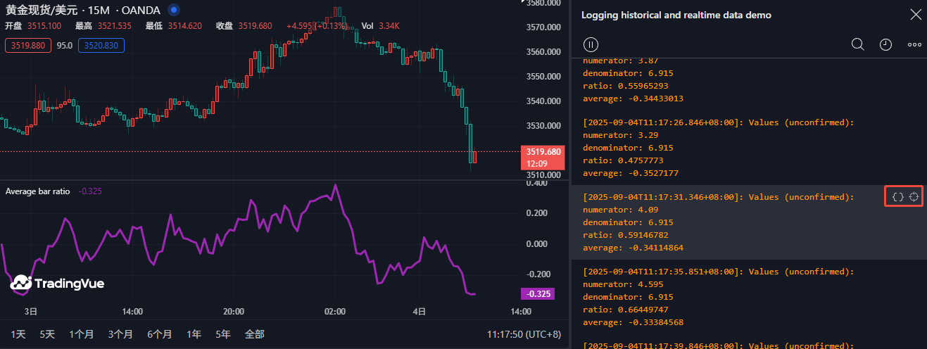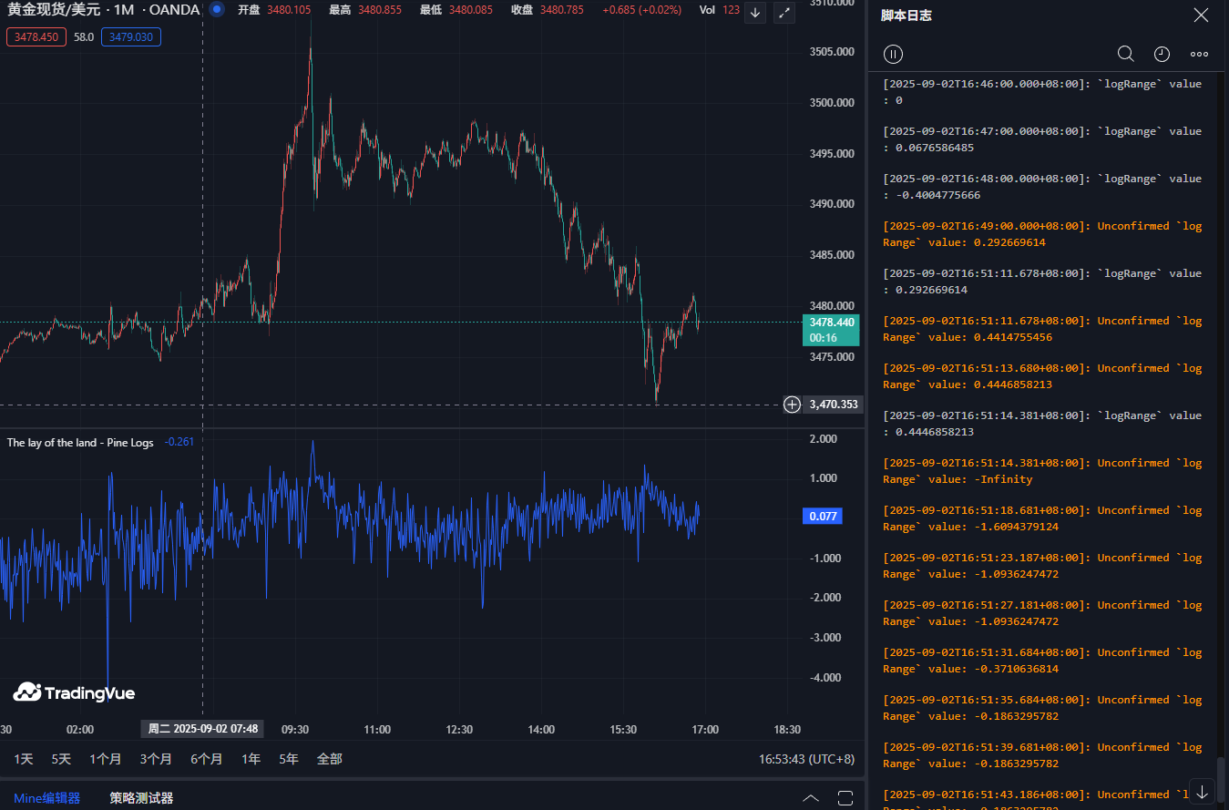 log.*()函数可生成Mine日志结果。每次脚本调用这些函数时,都会在Mine日志面板中记录一条消息,同时附带时间戳和导航选项,用于定位触发日志的具体时间、图表K线及代码行: