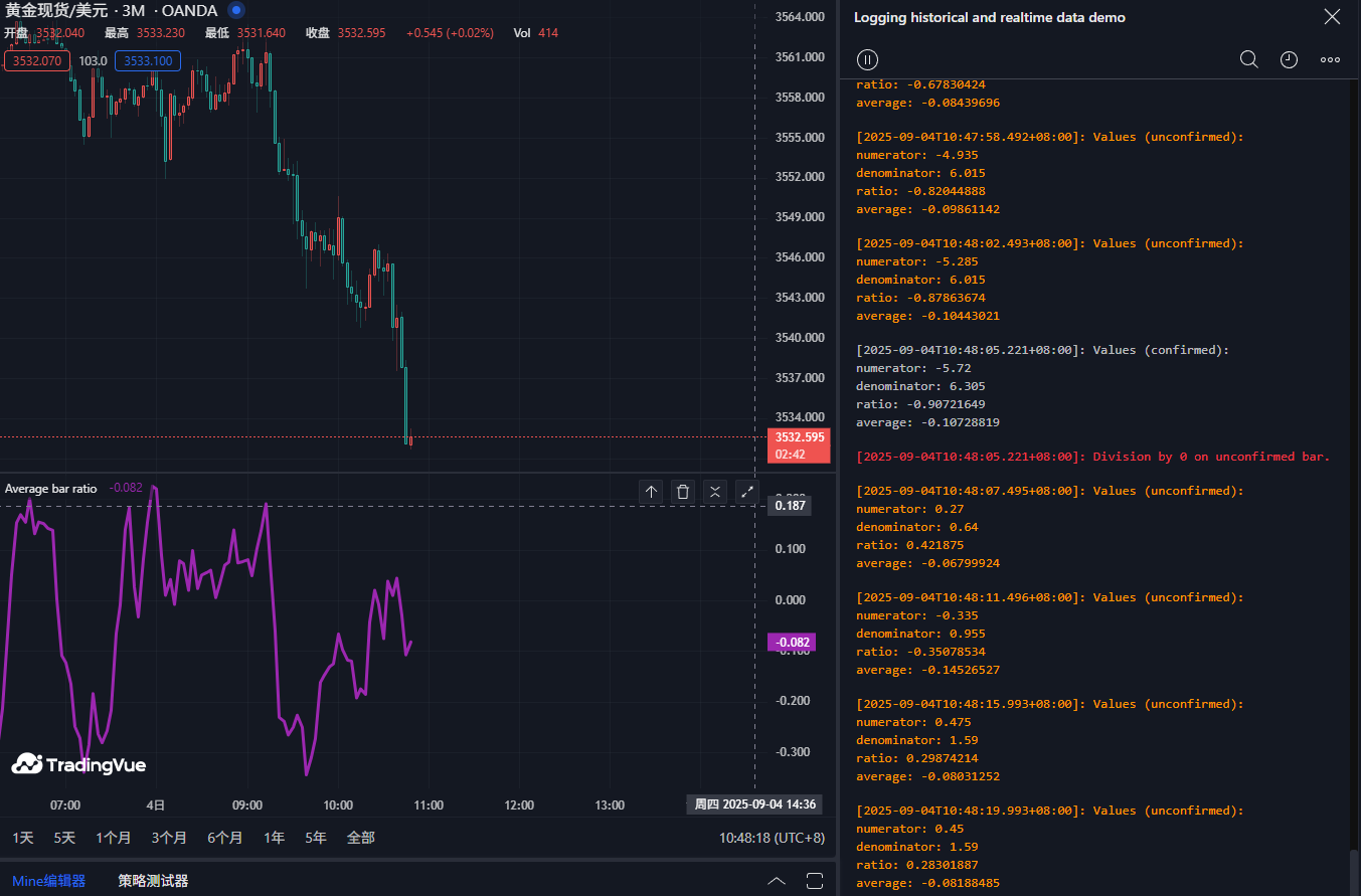 - Mine 日志不会在未确认K线的每个跳动点上回滚,这意味着这些跳动点的结果会一直显示在面板中,直到脚本重新开始执行。若仅需在已确认K线上记录消息,请在触发