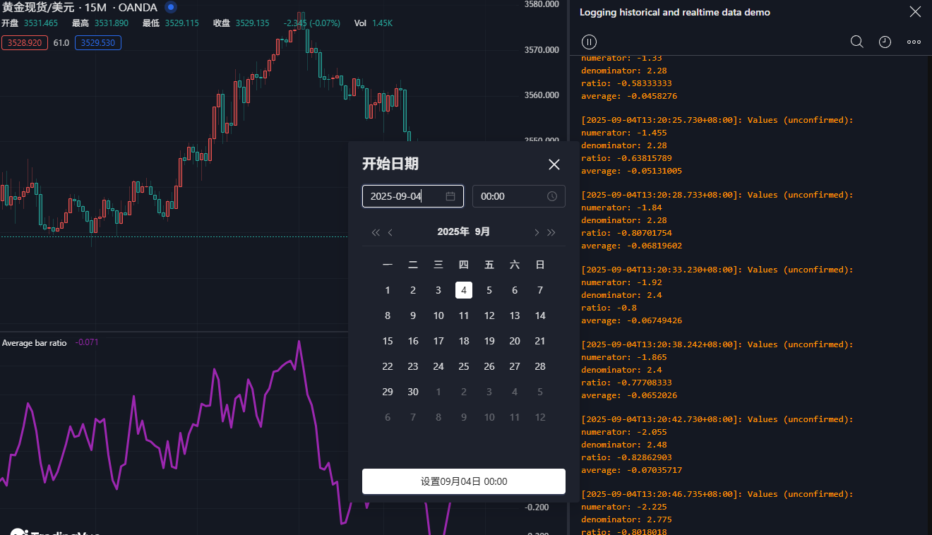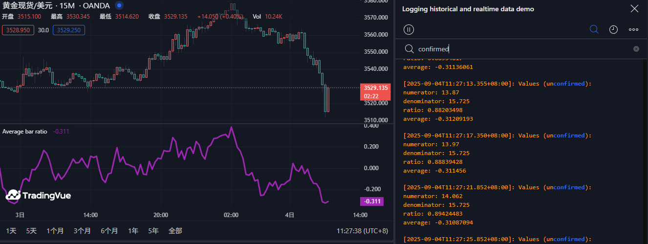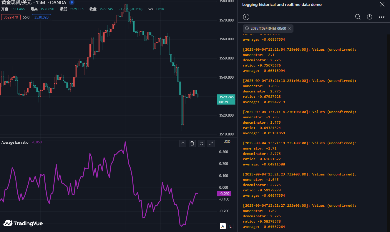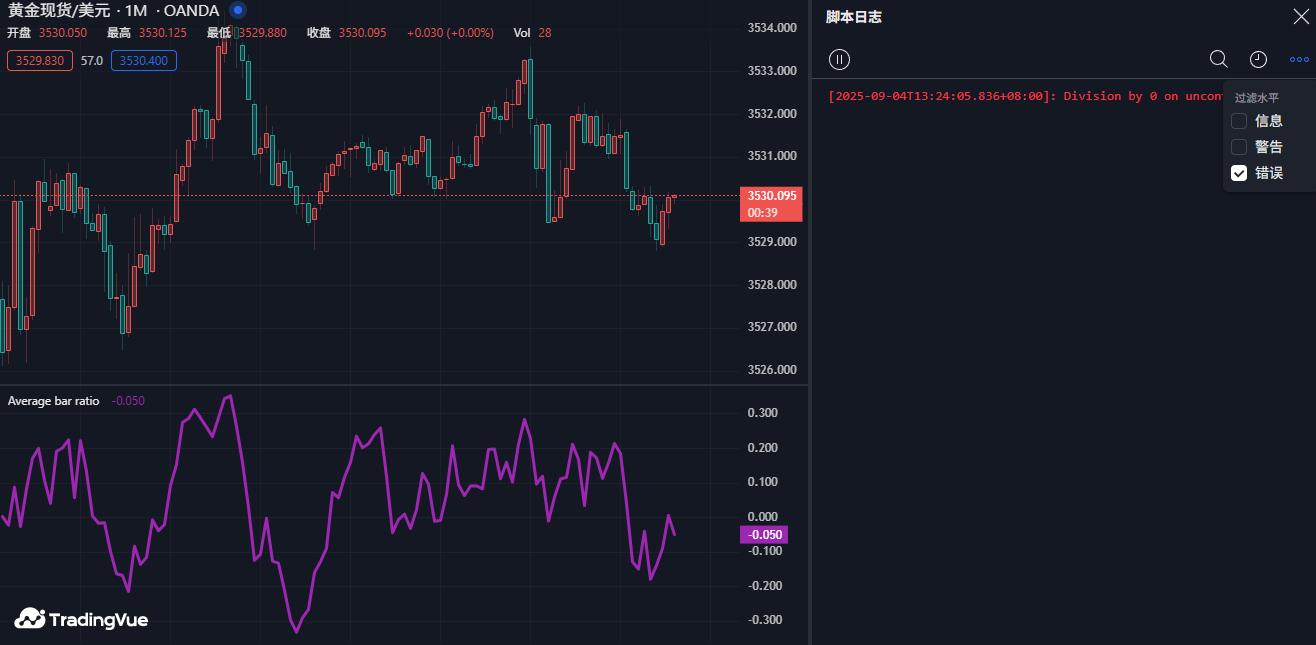 例如,此脚本计算每根K线的收盘价-开盘价与其最高价-最低价范围的平均比率。当分母非零时,脚本调用 log.info() 在已确认K线上打印计算变量的值,并调用 log.warning() 在未确认K线上打印值。否则,它使用 log.error() 指示发生除零错误,因为此类情况会影响平均结果: