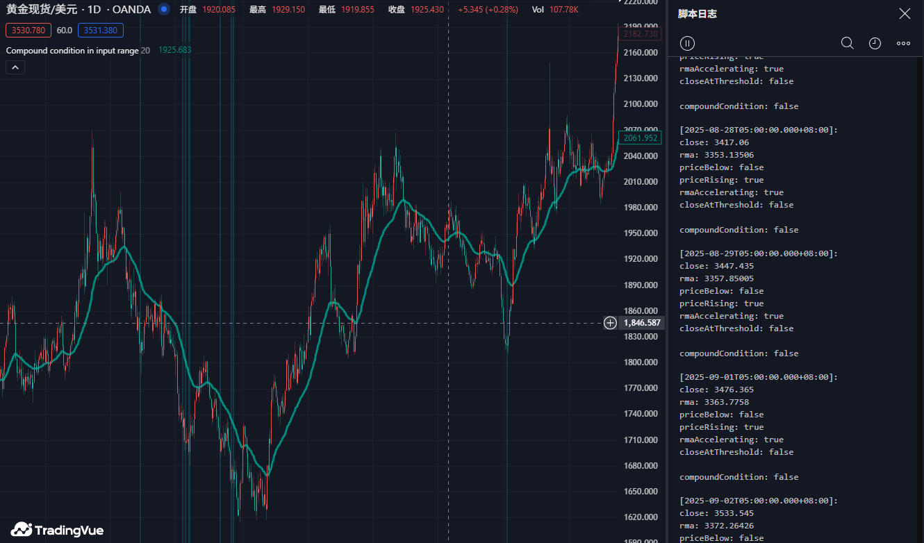 让我们看一个示例。此代码计算收盘价的 RMA 并声明几个独特条件以形成复合条件。脚本使用 log.info() 在 Mine 日志面板中显示重要调试信息,包括 compoundCondition 变量及其结果所依赖的“布尔”变量的值。