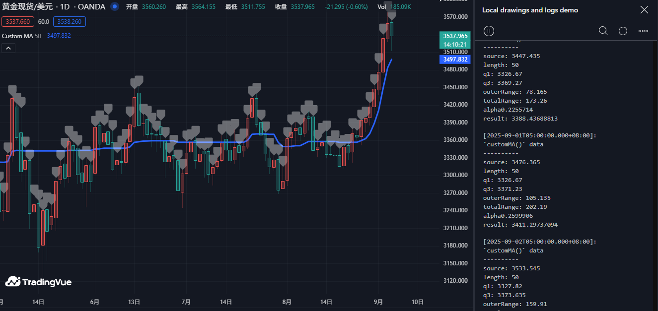 max_labels_count = 500,以显示最近500次customMA()调用的标签。 - 该函数在 if 语句中使用 barstate.isconfirmed,仅对已确认的K线调用 log.info()。它不会在每个实时跳动点上记录新消息。