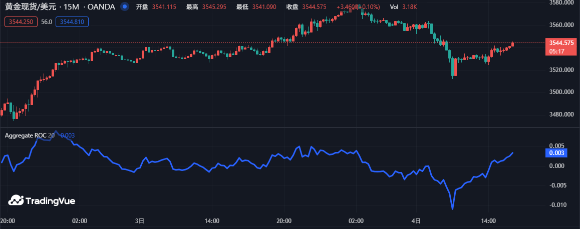 我们将以此脚本作为后续示例的起点。该脚本聚合 close 值在 1 - lookbackInput 根K线上的变化率,并在 for 循环中累加它们,然后将结果除以 lookbackInput 以计算最终平均值: