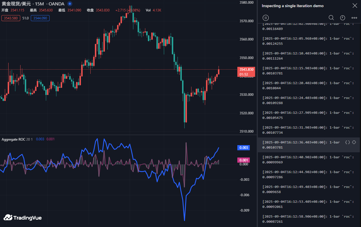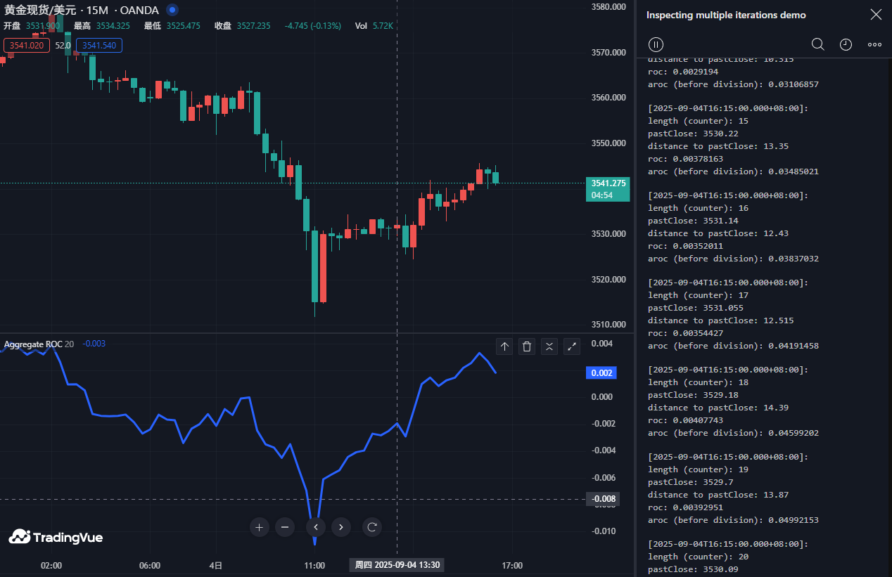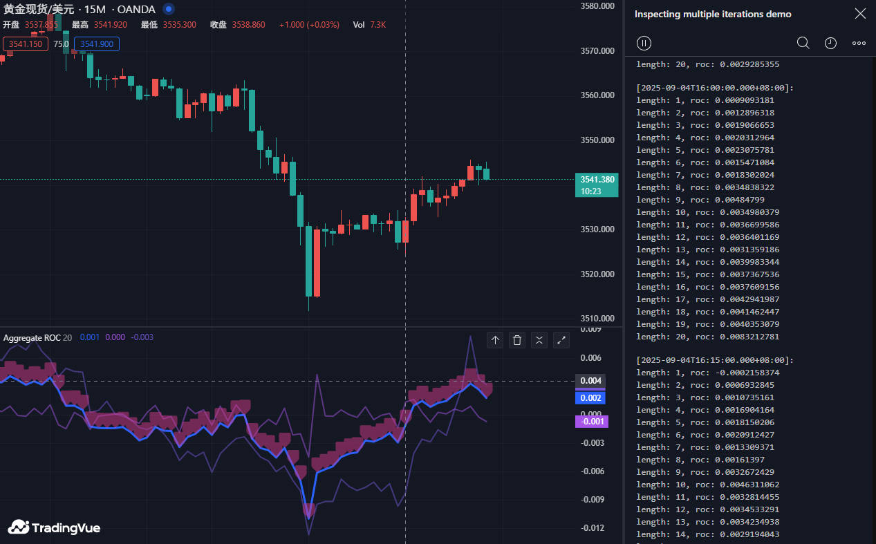 此示例通过三种不同方式检查循环中单个迭代的局部 roc 值。当循环计数器的值等于 debugCounterInput 时,脚本将 roc 赋值给全局作用域中的 rocDebug 变量用于绘图,使用 line.new() 从 0 到 roc 值绘制垂直线,并使用 log.info() 在 Mine日志面板中记录消息: