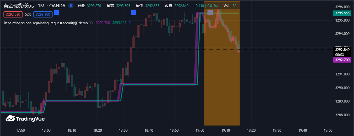 - 使用request.security()在实时K线上获取更高时间周期数据(如其他时间周期和数据页面的历史与实时行为章节所述)。与图表时间周期的未确认K线类似,该函数可追踪更高时间周期上下文的未确认值,导致脚本重启执行后出现重绘。