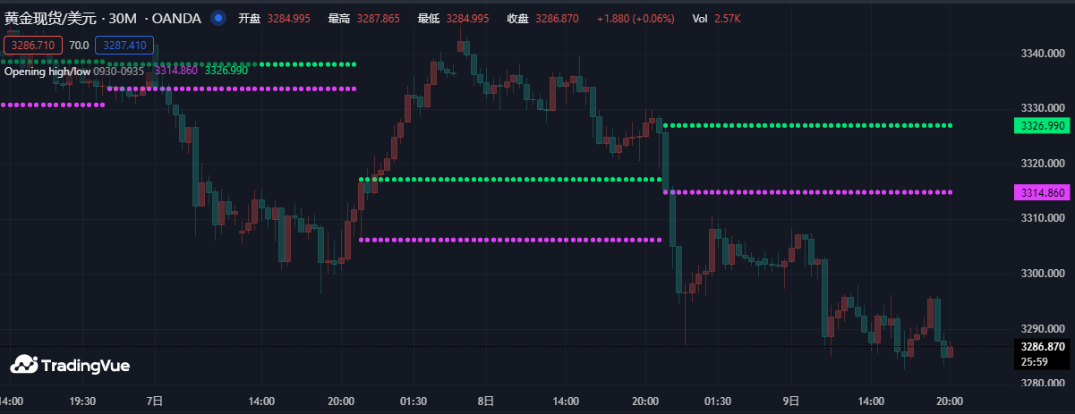 time(timeframe, session) → series int此处,我们使用带交易时段参数的 time() 函数,在日内图表上显示市场的开盘高值和低值: