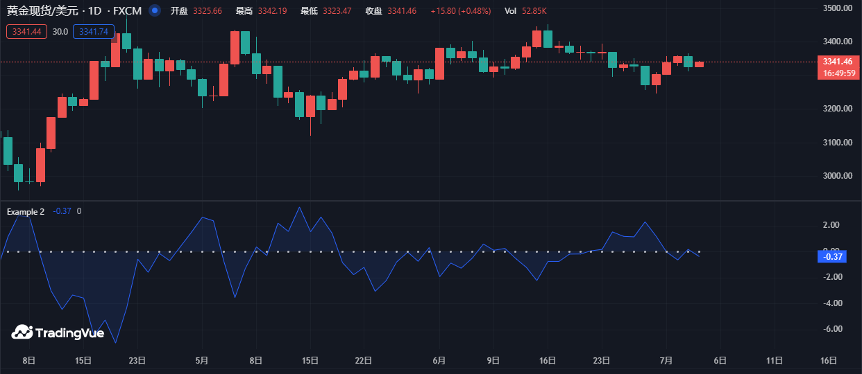 例如,该脚本通过计算收盘价与10周期SMA的百分比距离生成振荡器(oscillator),并绘制在图表面板。虽然零轴线可用hline()显示(因其值不变),但由于fill()函数不接受“绘图”与“水平线”ID混合参数,我们必须使用plot()绘制零轴线才能实现填充效果: