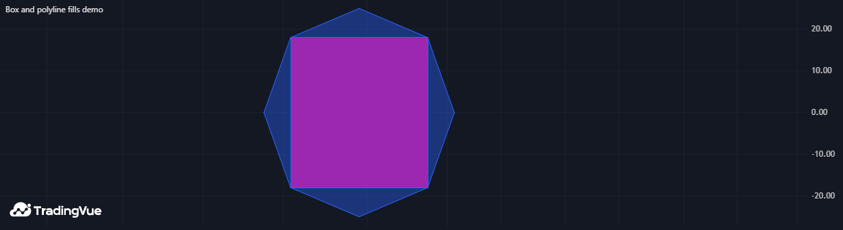 使用box.new()的bgcolor参数填充方框内部 使用polyline.new()的fill_color参数填充折线区域 例如,该脚本在最后一根确认的历史K线上绘制八边形(折线)及内接矩形(方框)。通过radius变量控制图形大小(约为可见K线数的1/4)。在polyline.new()调用中设置fill_color = color.new(color.blue, 60)使八边形填充半透明蓝色,而box.new()调用中的bgcolor = color.purple将矩形填充为纯紫色: