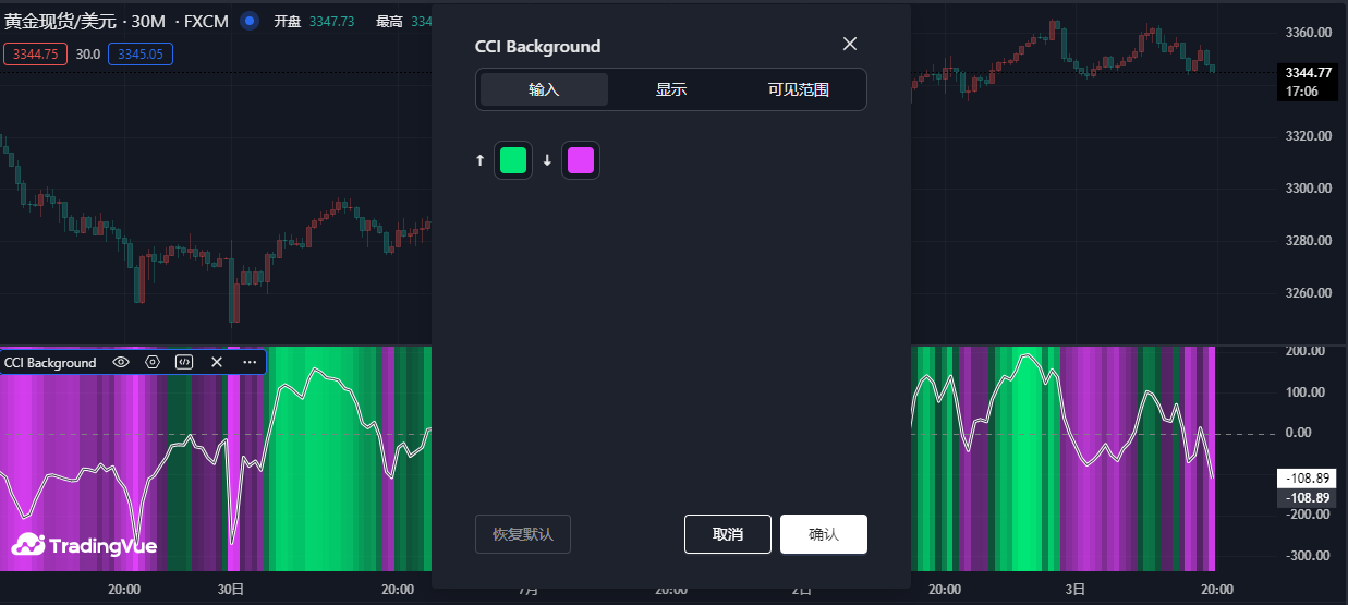 inline = "1"将两个颜色选择控件放在同一行。 - 我们使用两个plot()调用来绘制CCI信号线以在复杂背景上实现最佳对比度:第一个plot()调用绘制3像素宽的白色背景线,第二个plot()调用绘制1像素宽的黑色细线。